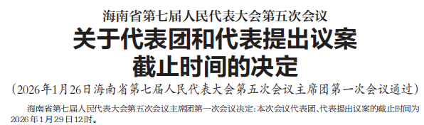海南省第七届人民代表大会第五次会议将于1月27日至31日在海口举行。大会将于27日上午9时在省人大会堂隆重开幕。